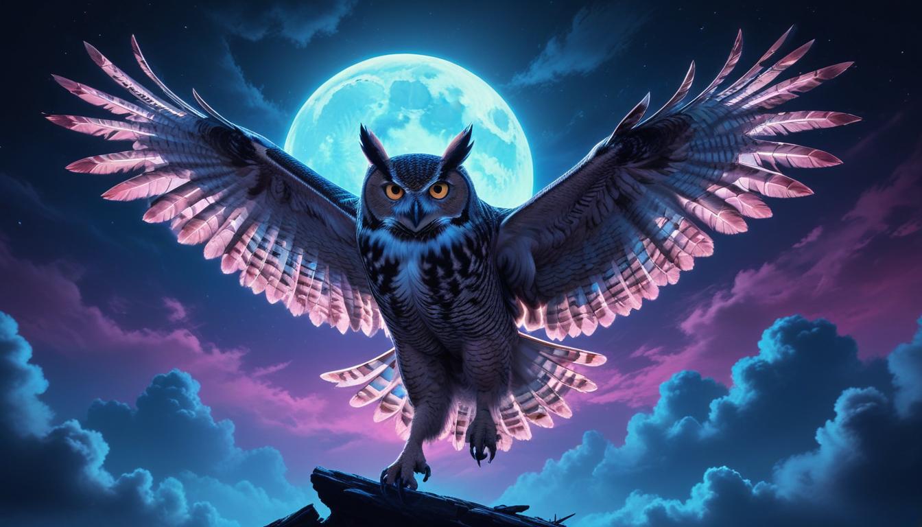 animal, art, artwork, bird, blue, clouds, digital, fantasy, feathers, flying, moon, nature, night, nocturnal, owl, predator, purple, sky, wildlife, wings