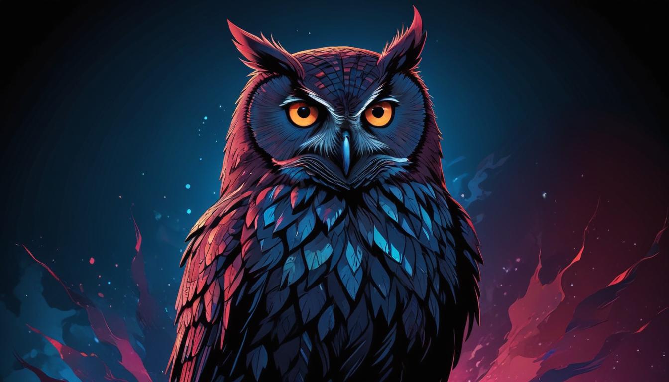 A colorful digital portrait of an owl with large, bright eyes, set against a dark background with splashes of red and blue.