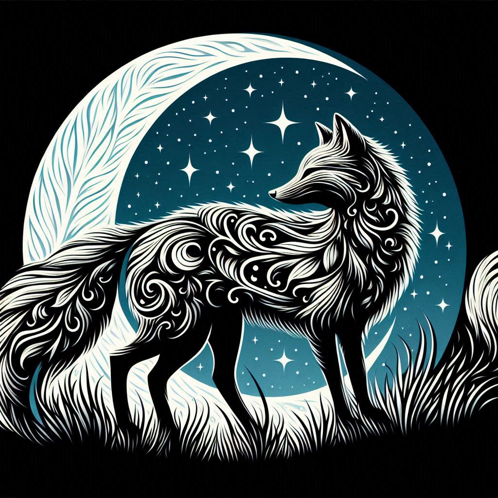 Ornate fox under crescent moon