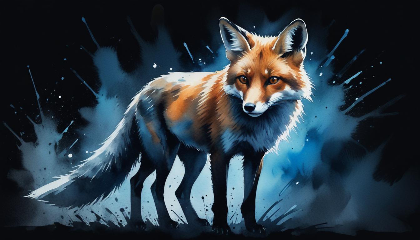 A red fox stands against a dark blue and black watercolor background with a splash of white.