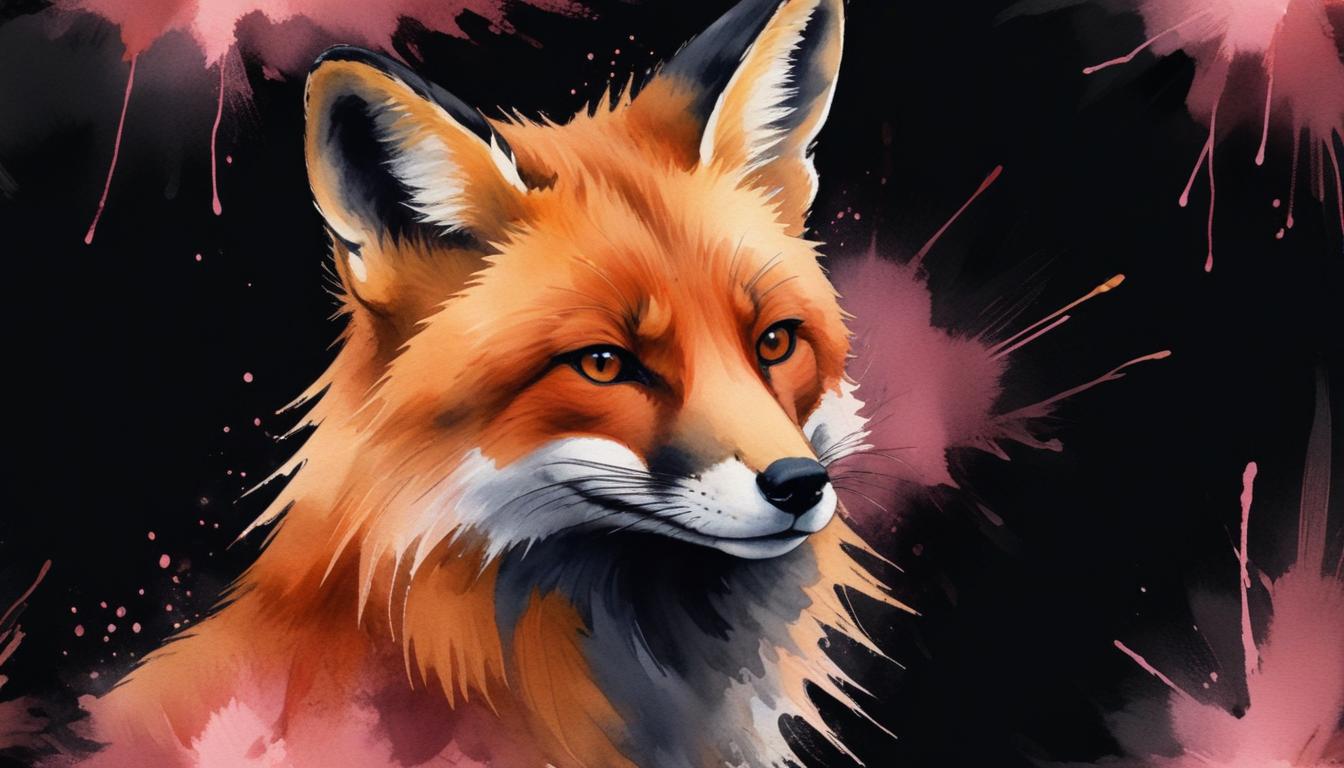 A close-up portrait of a red fox with a soft, watercolor background of pink splashes.