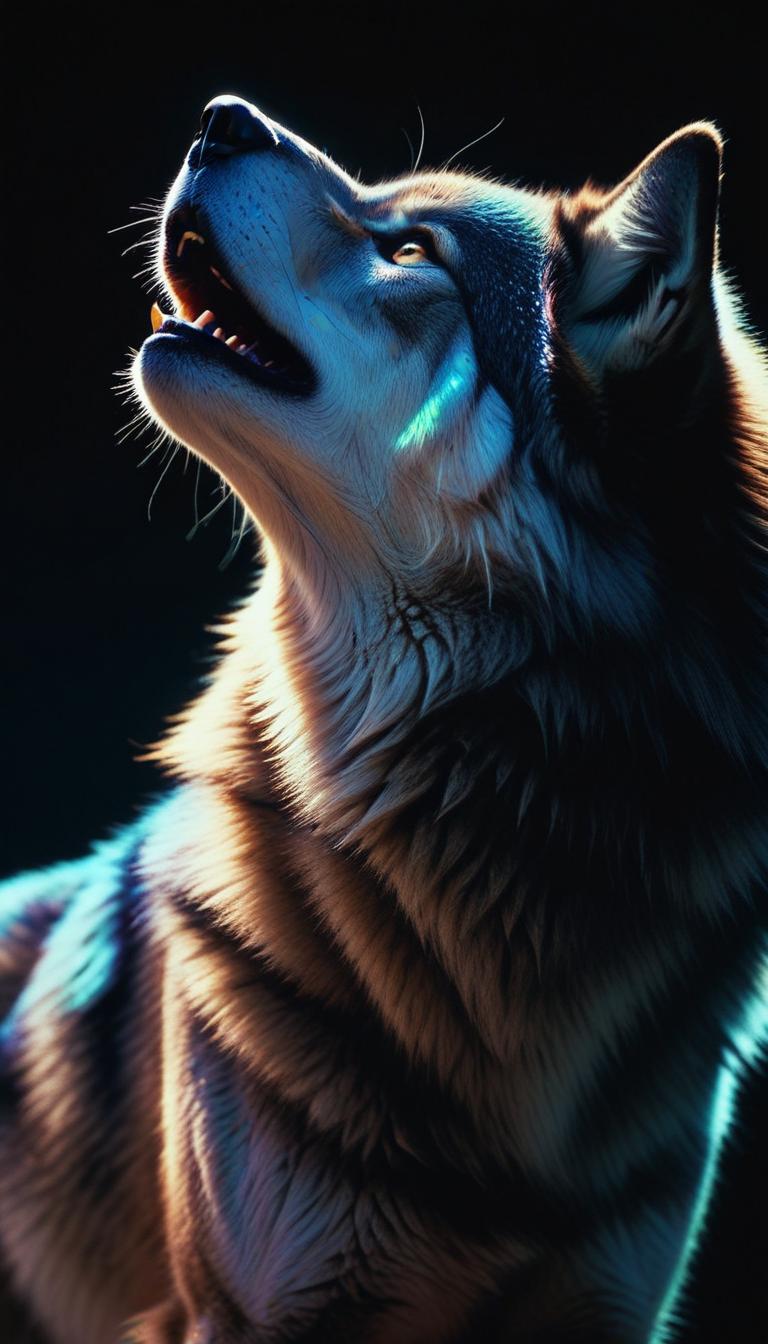 A wolf howls at the night sky, its fur illuminated by an ethereal blue light.