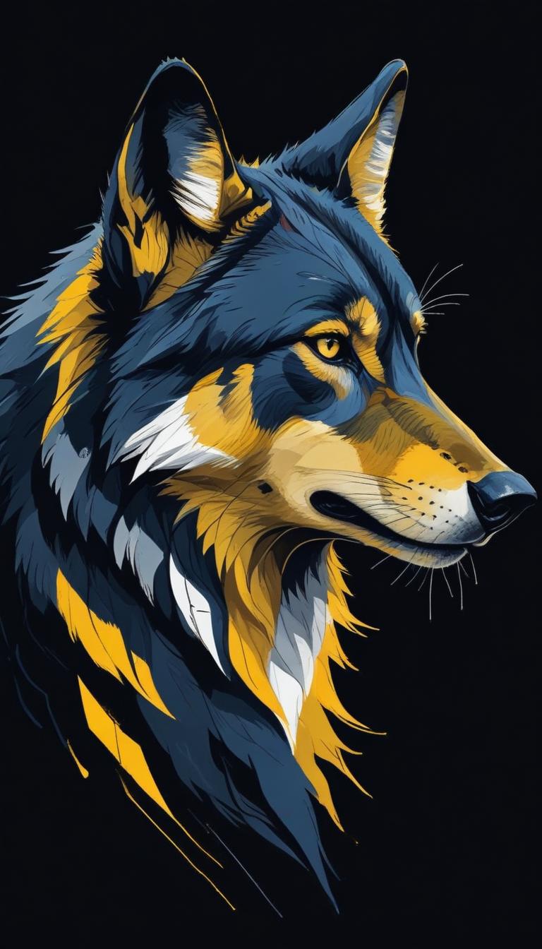 Stylized wolf portrait in blue and yellow against black background, head turned to side with focused eyes off-screen