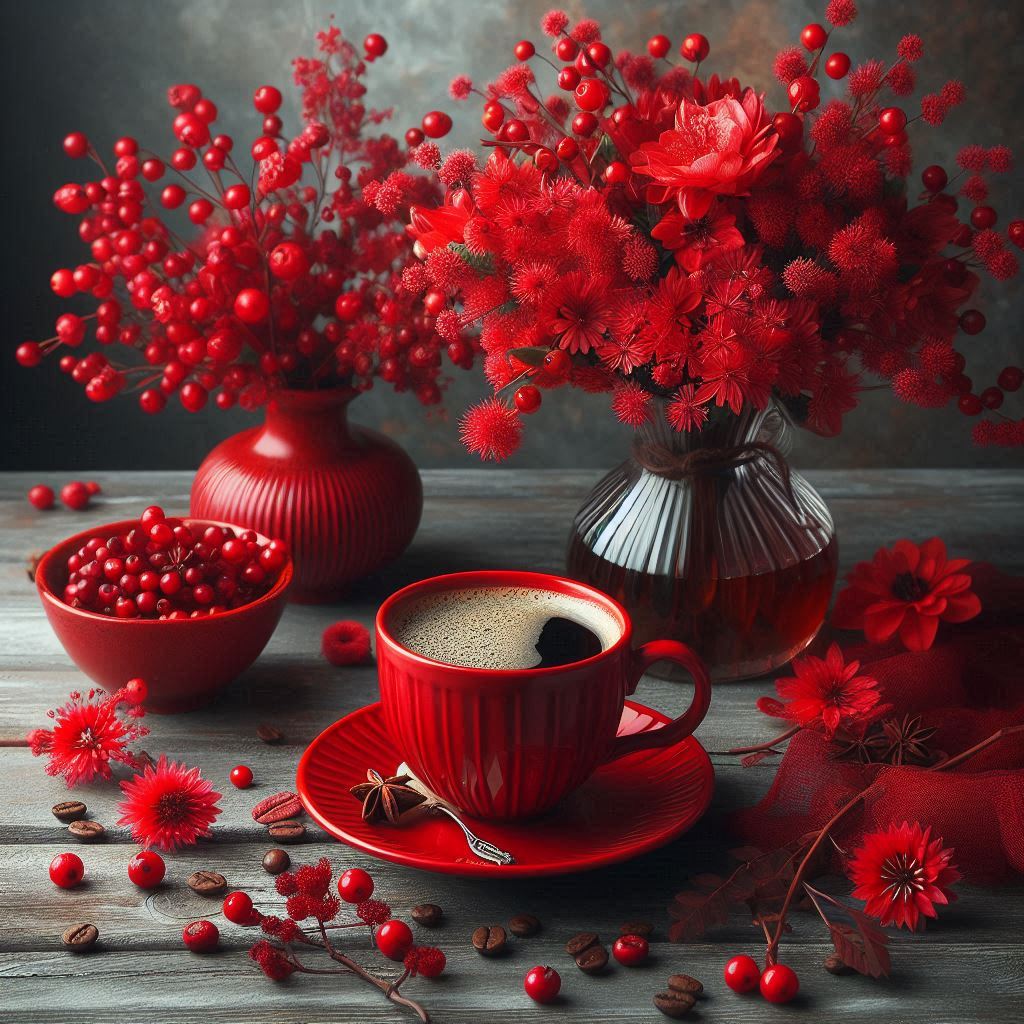 beans, berries, breakfast, coffee, cozy, cup, decor, decoration, design, floral, flowers, home, life, red, saucer, still, table, vase, warm, wooden