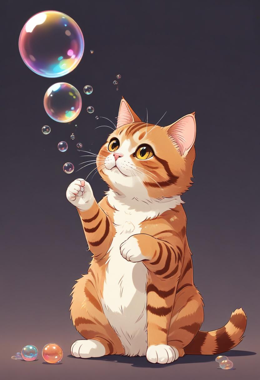 animal, art, bubbles, cartoon, cat, colorful, cute, design, digital, drawing, float, furry, graphic, illustration, iridescent, orange, pet, play, round, tabby