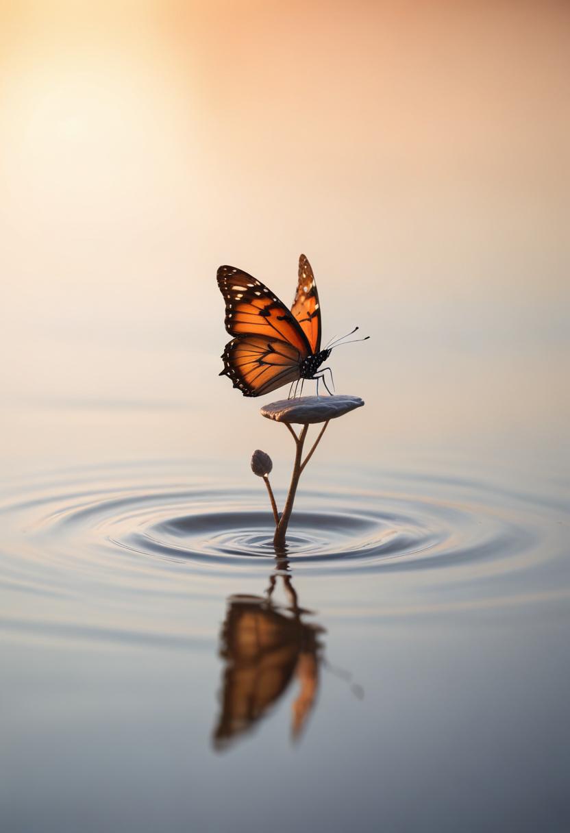 A butterfly rests on a thin stem rising from still water, its reflection visible in the ripples.