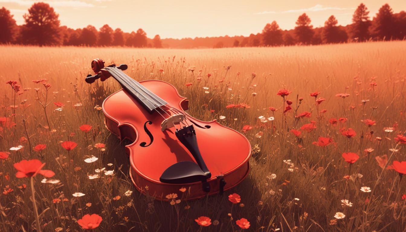 A red violin rests in a field of wildflowers, bathed in warm evening light.