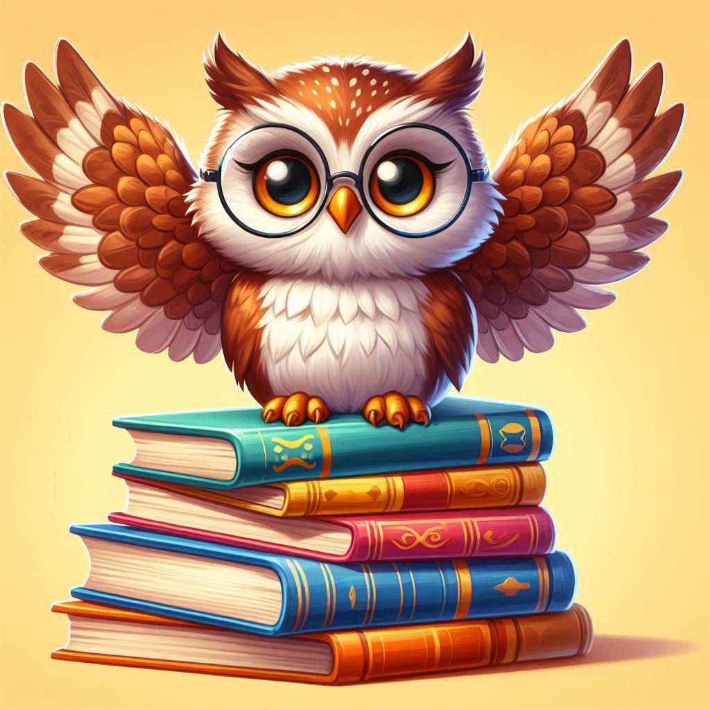 A cartoon owl with large eyes and glasses is perched atop a stack of colorful books.