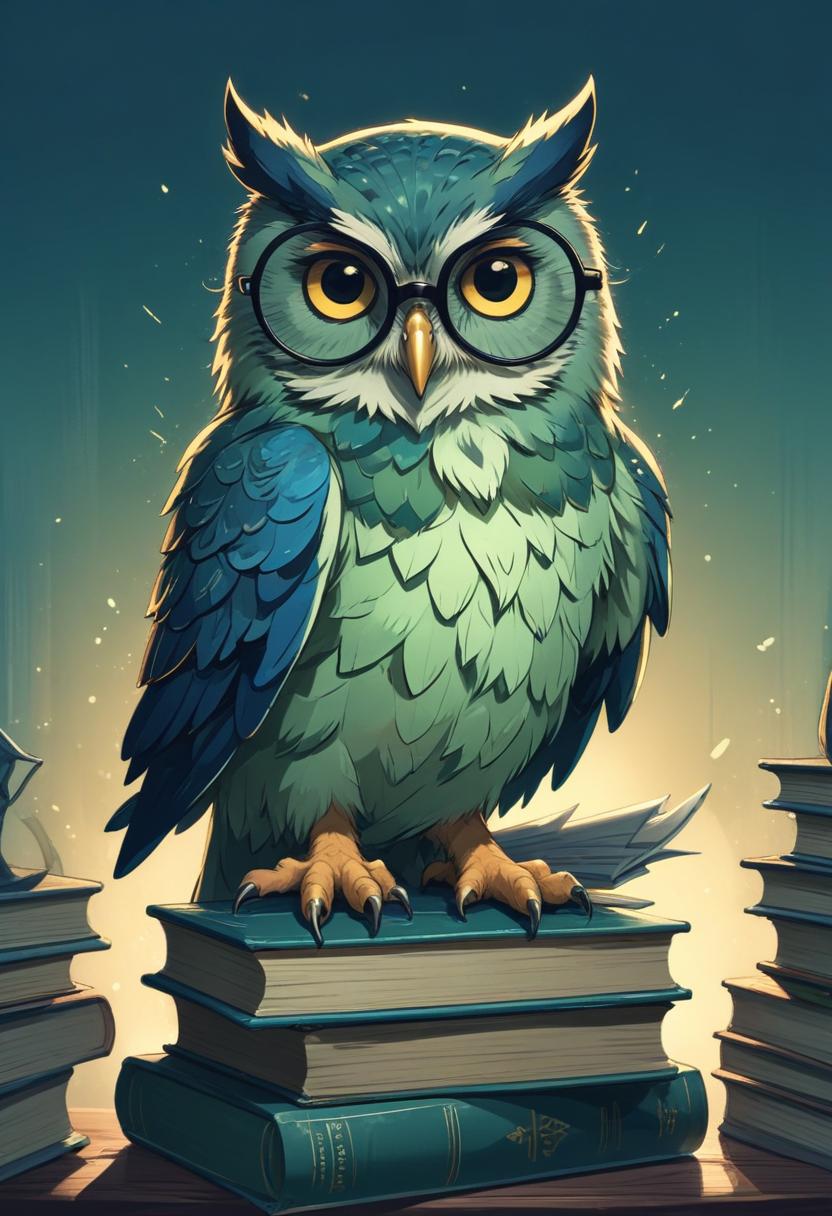 bird, book, bookshelves, cartoon, cute, education, glasses, illustration, knowledge, learning, library, literature, night, owl, perched, reading, school, stack, studying, wisdom