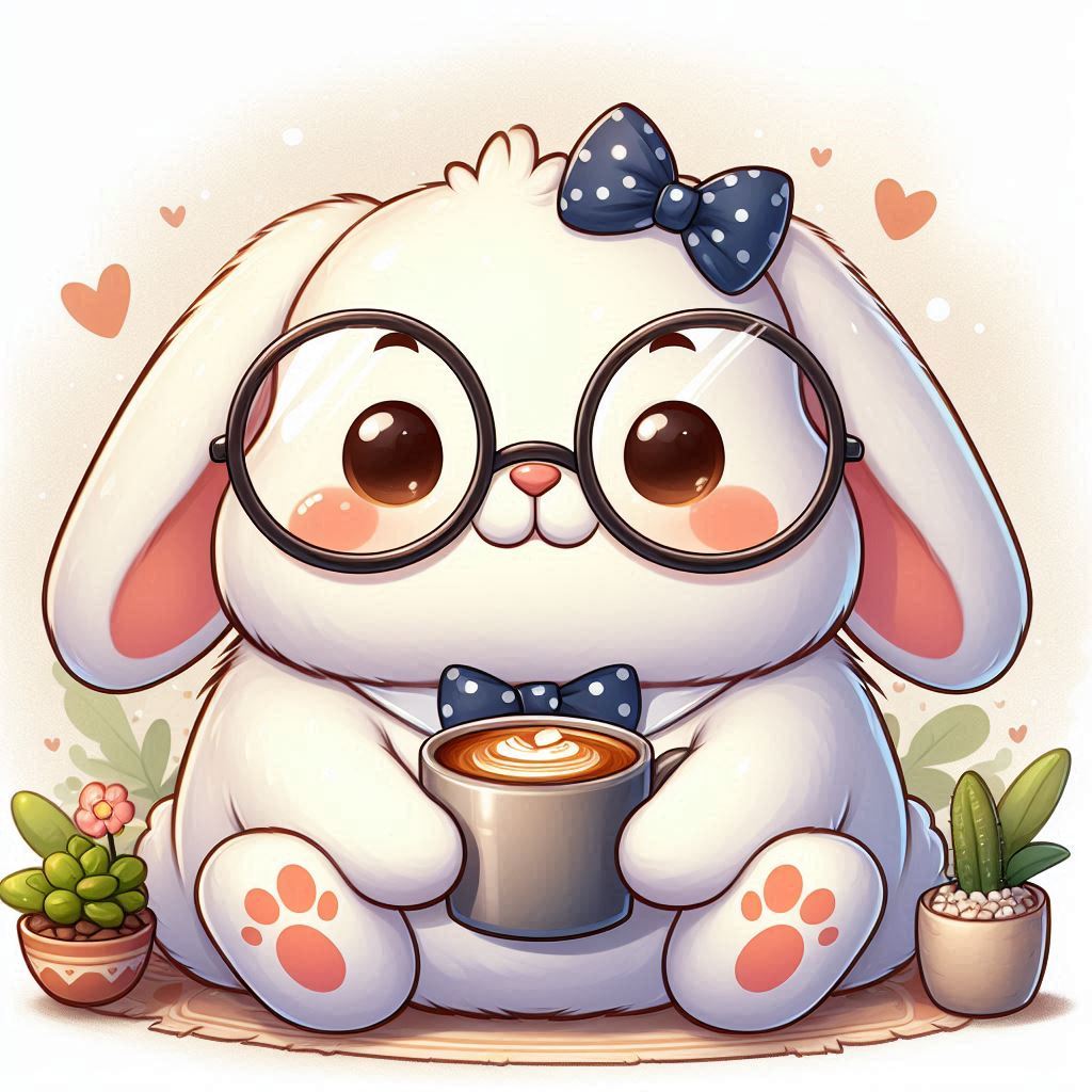 A cartoon bunny wearing glasses and a bow holds a cup of coffee.