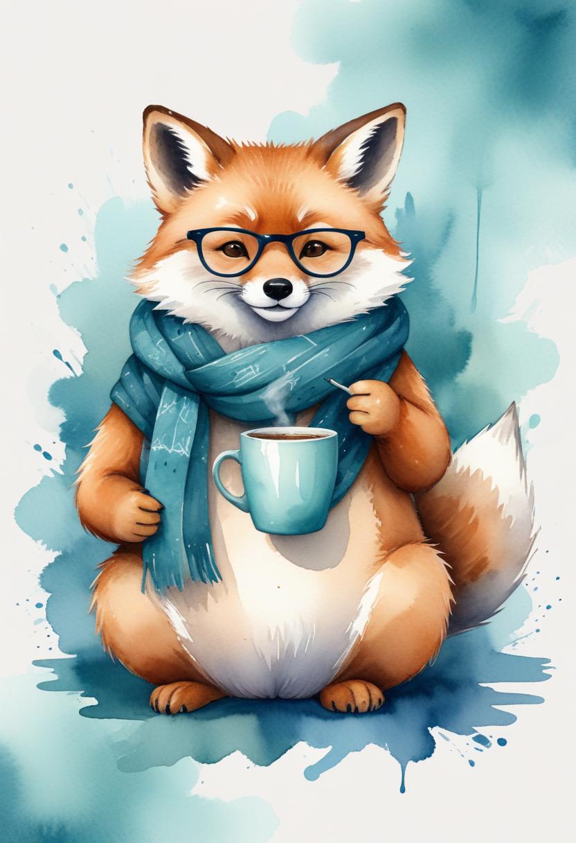 adorable, animal, beverage, blue, cartoon, coffee, cute, drink, fox, funny, glasses, hot, illustration, mammal, mug, scarf, sitting, tea, watercolor, whimsical