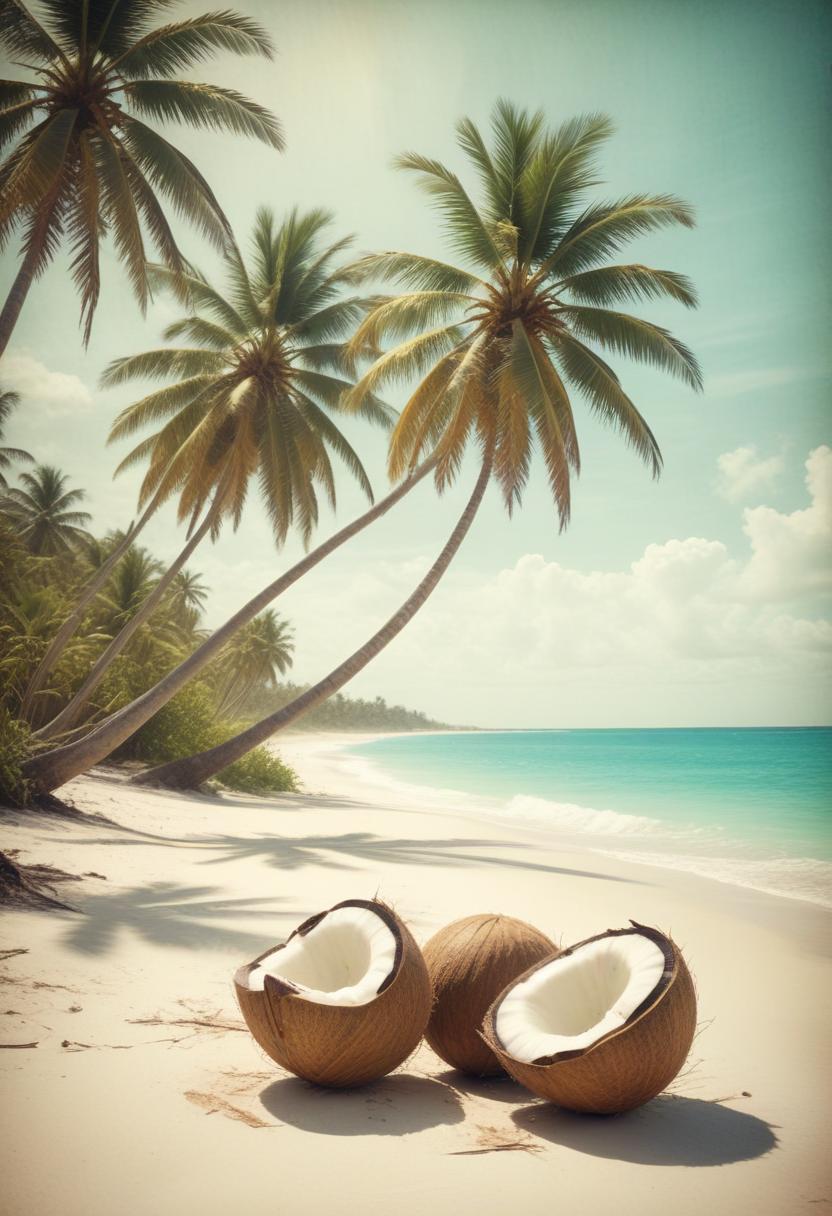 Three coconuts sit on a sandy beach surrounded by palm trees. The turquoise water laps at the shore, and the sky is bright blue.