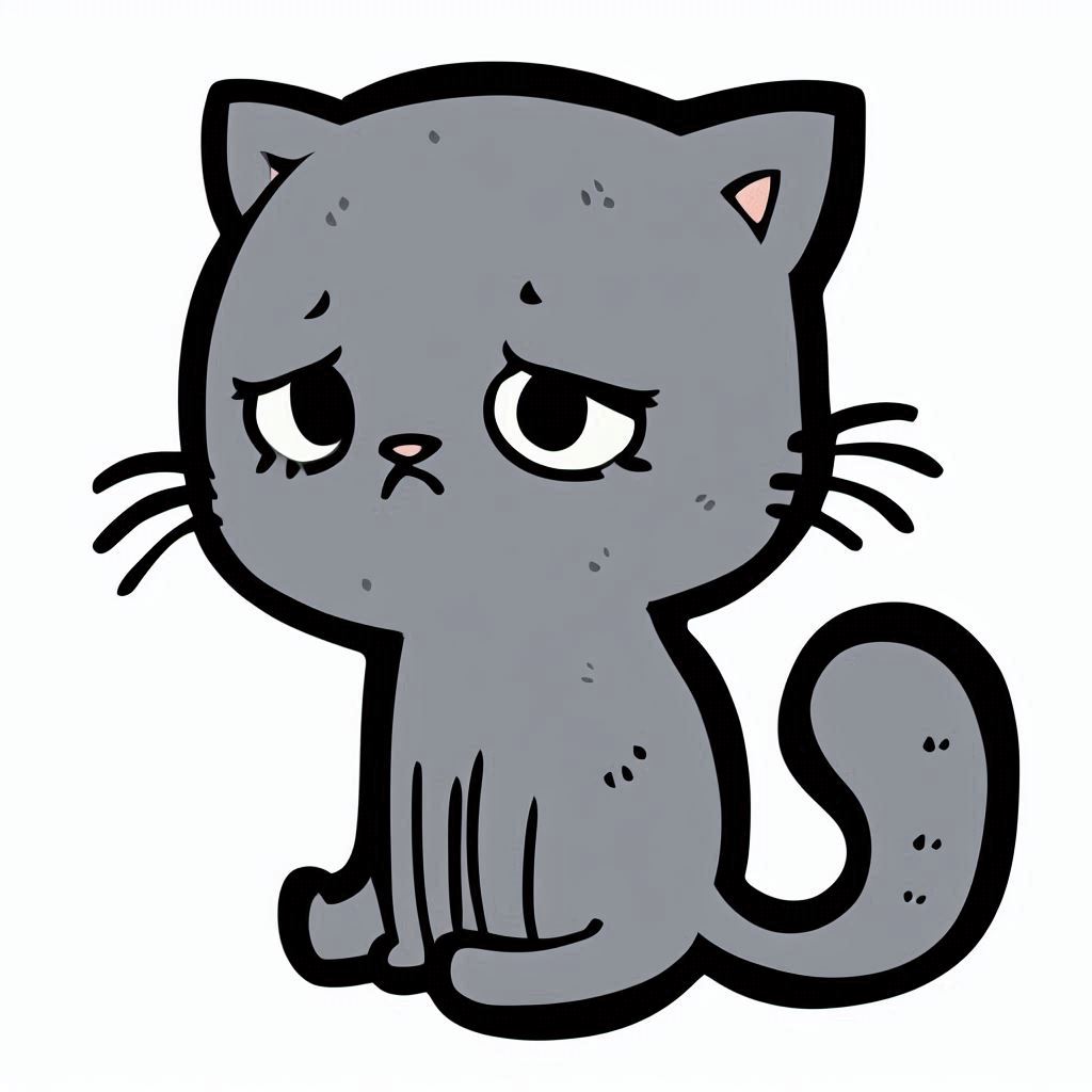 A cartoon cat with a sad expression sits with its tail curled around its body.