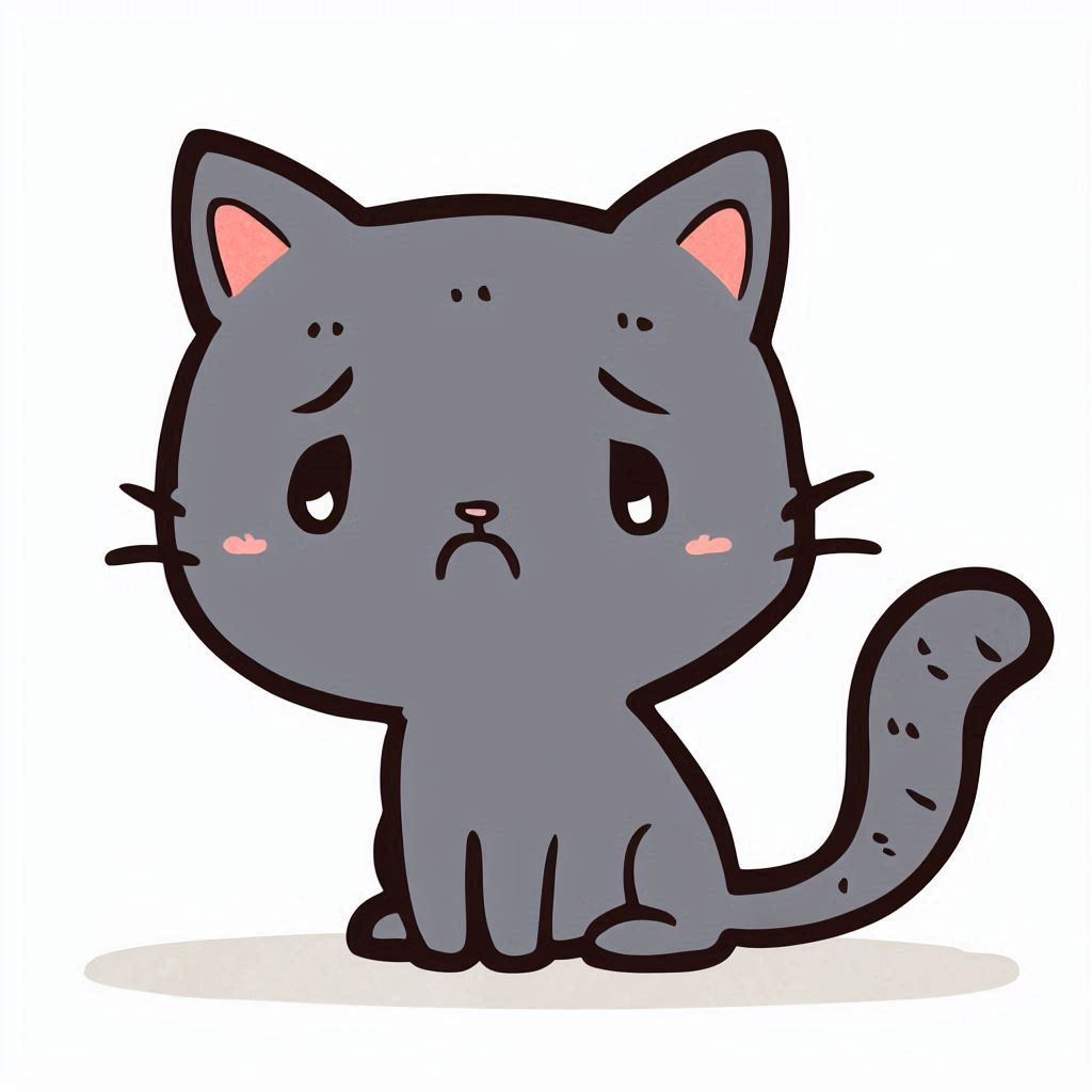 A cartoon cat with a sad expression sits on a white background.