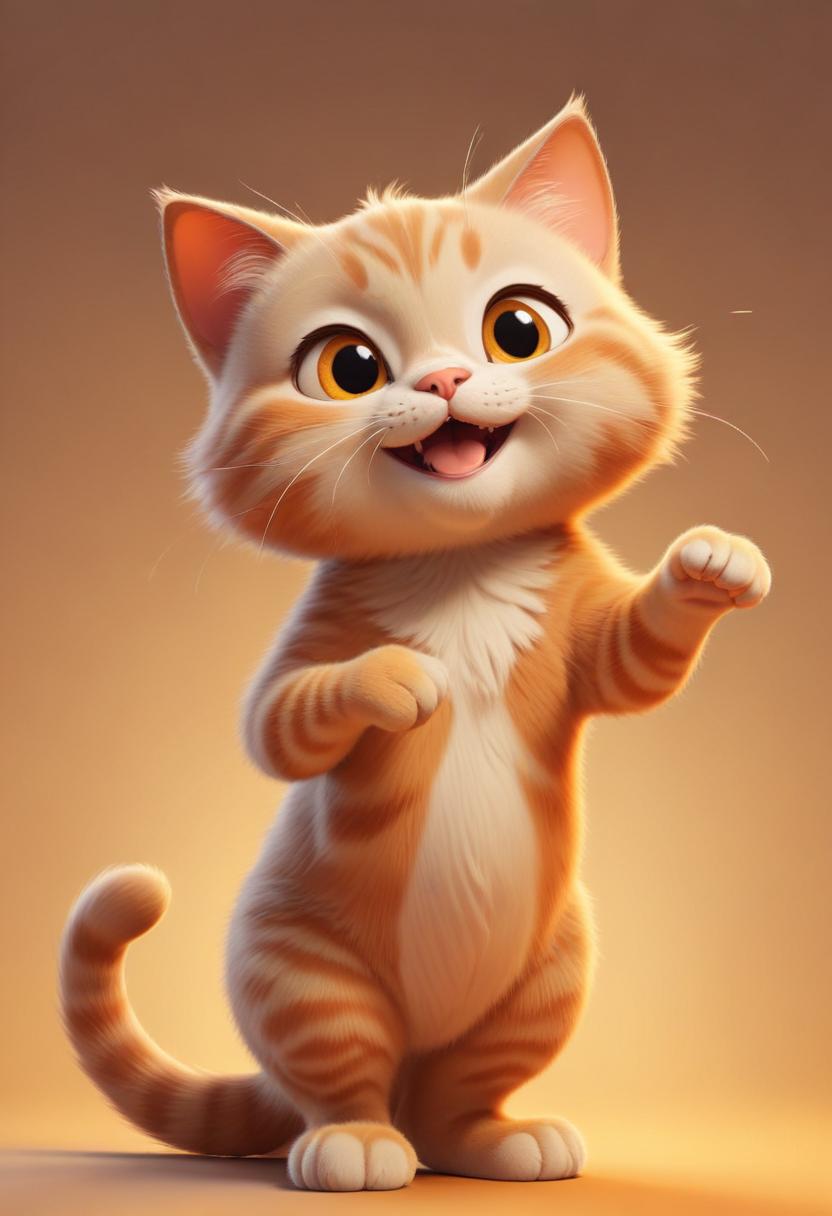 A cute orange tabby kitten stands on its hind legs with its front paws up in the air and a happy expression.