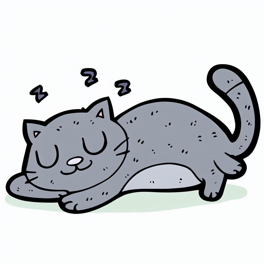 A cartoon cat sleeps soundly with its eyes closed and paws curled up.