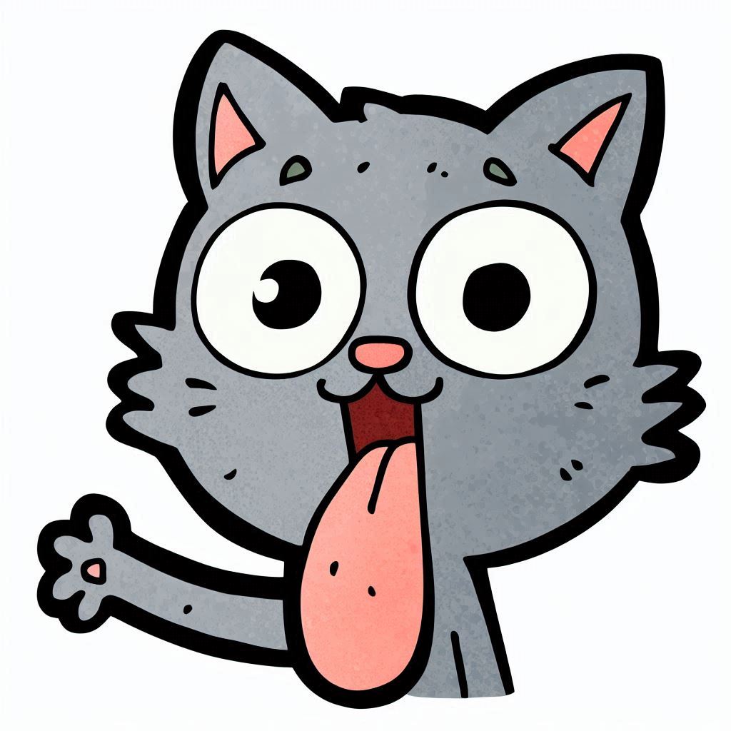 A cartoon cat with big eyes sticks out its tongue while waving its paw.