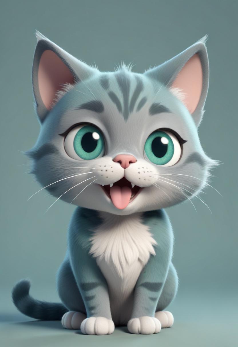 adorable, animal, art, background, blue, cartoon, cat, cute, digital, eyes, feline, furry, grey, happy, illustration, pet, sitting, smile, tongue, white