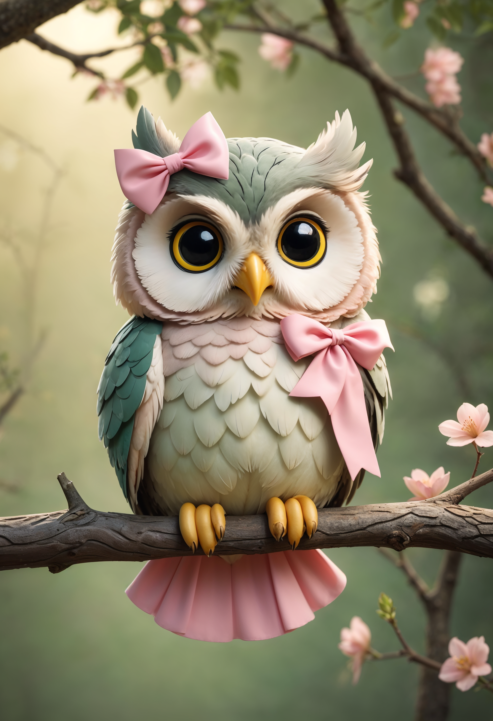 A cartoon owl with large eyes and pink bows sits on a branch with pink flowers.