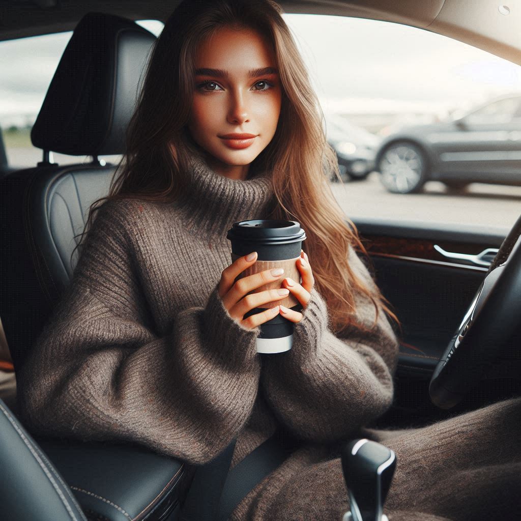 brown, car, coffee, cozy, cup, drive, driver, fashion, female, hand, hold, interior, portrait, seat, sweater, transportation, travel, vehicle, warm, woman