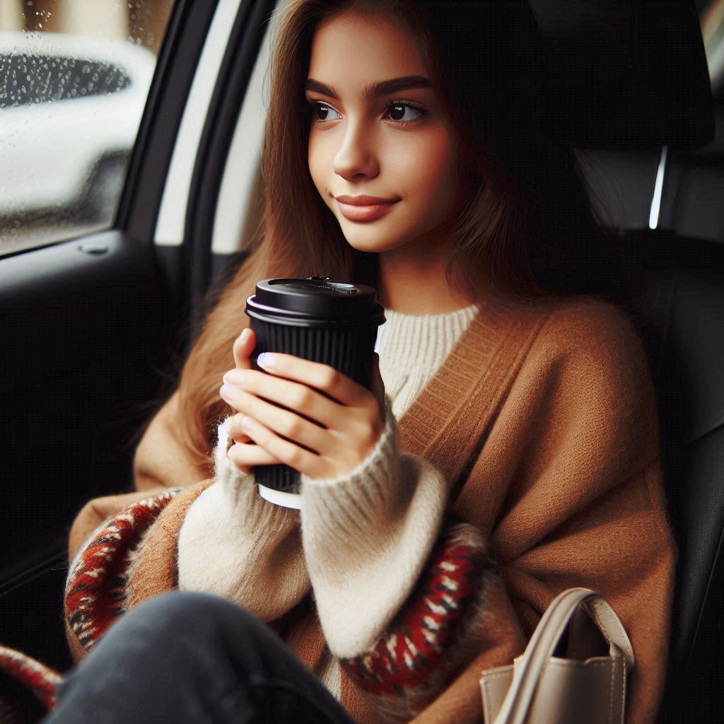 A young woman sits in a car, wearing a brown cardigan, holding a cup of coffee and looking out the window.