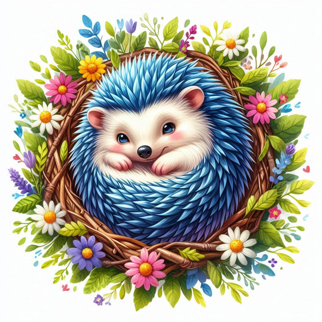 A blue hedgehog curls up in a nest of twigs and colorful flowers.