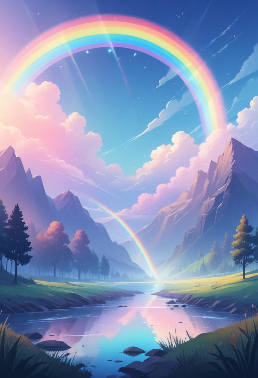 art, clouds, colorful, digital, double, field, illustration, landscape, mountains, nature, painting, peaceful, rainbow, river, scenery, sky, tranquil, trees, valley, vibrant