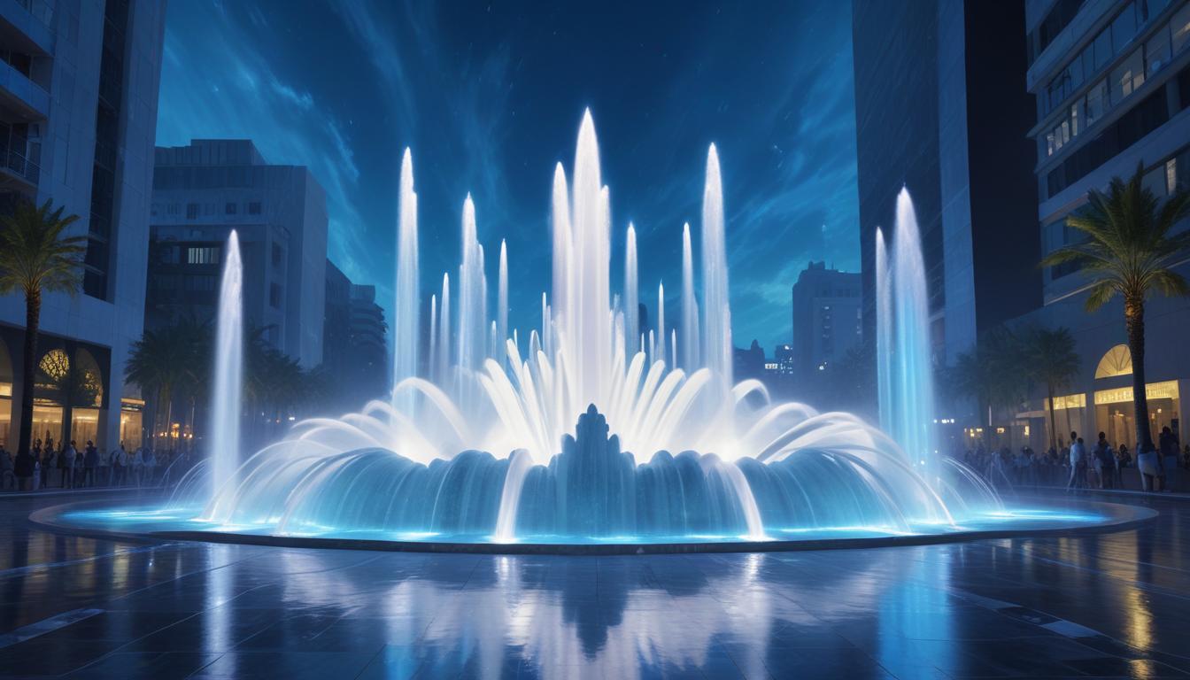architecture, blue, buildings, city, cityscape, downtown, evening, fountain, illuminated, jets, lights, modern, night, public, reflection, sky, space, square, urban, water