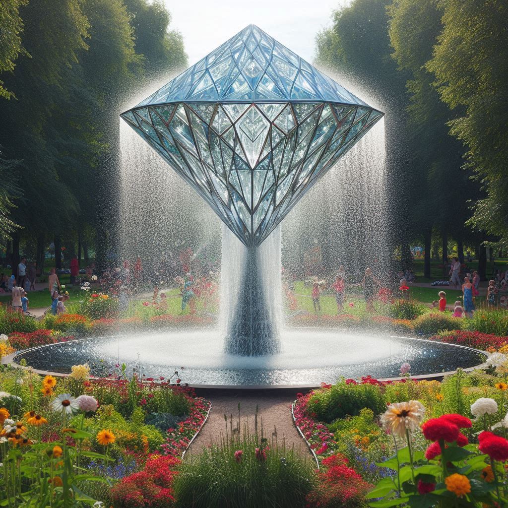 architecture, art, design, diamond, flowers, fountain, garden, glass, grass, landscape, nature, outdoor, park, pool, public, sculpture, summer, trees, urban, water