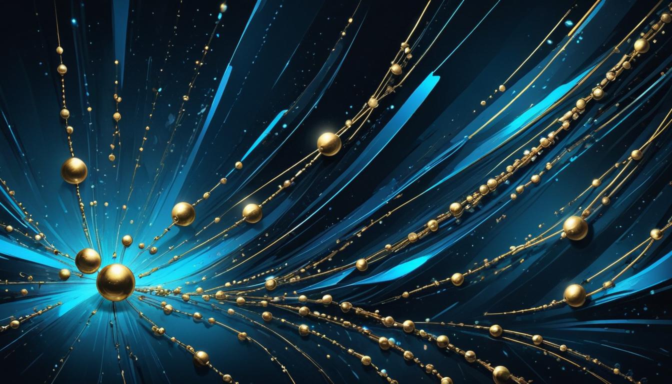 A digital illustration of gold spheres strung on chains that are radiating outward from the center on a blue background with streaks of light.