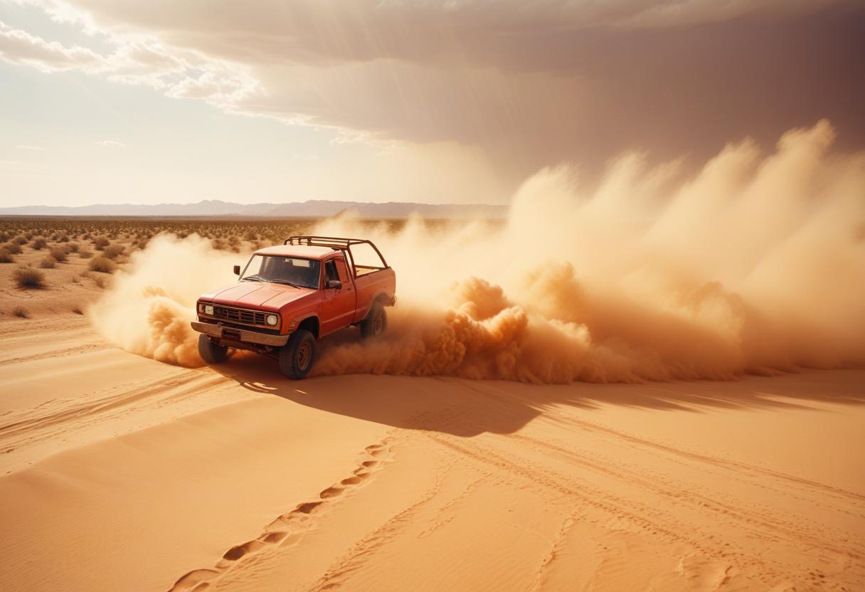A red truck drives through a desert landscape, kicking up a cloud of sand behind it. The sky is cloudy and the sun is shining brightly.