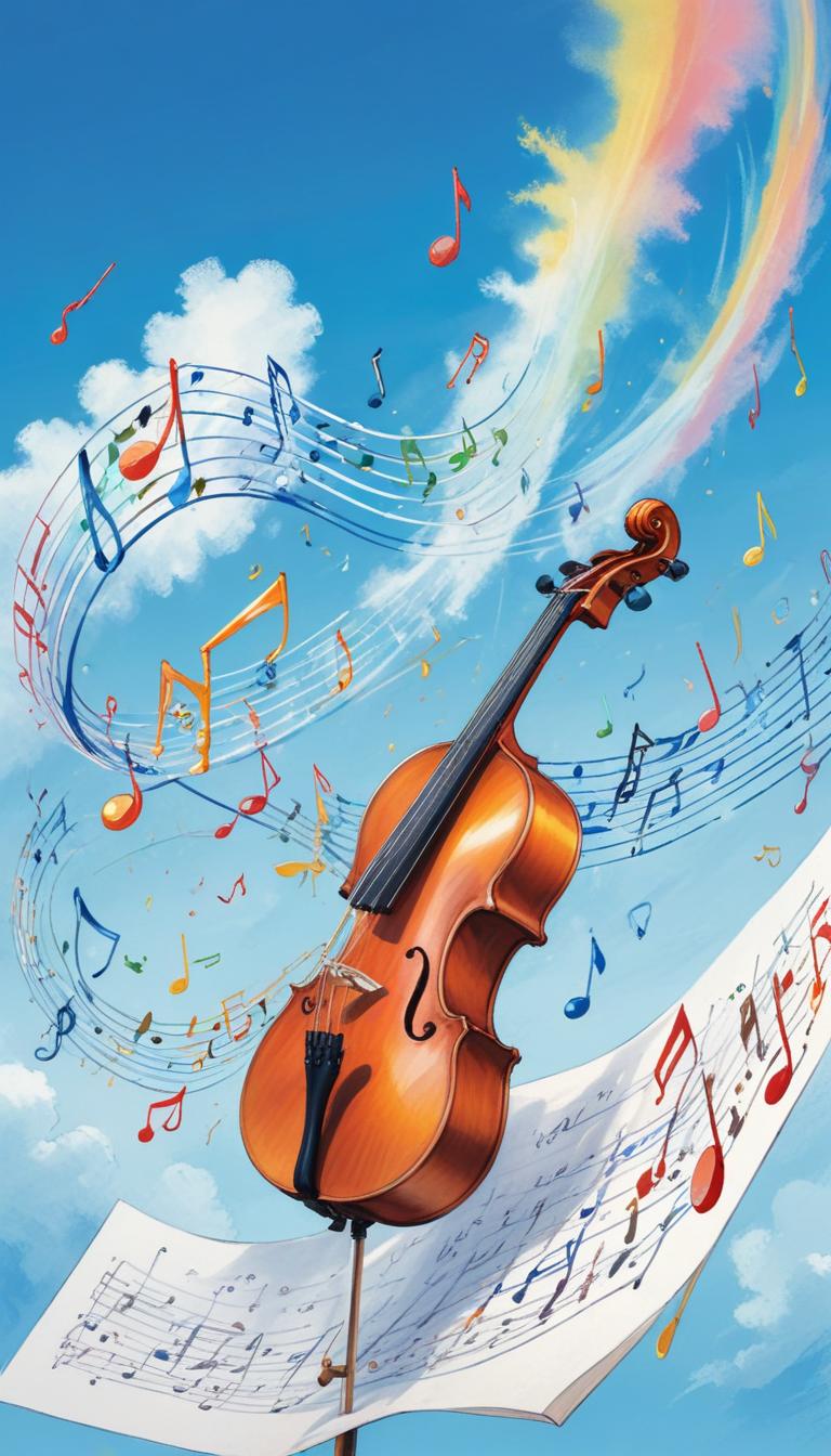 art, bright, classical, clouds, colorful, dream, fantasy, happy, harmony, illustration, instrument, joyful, melody, music, musical, notes, painting, rhythm, sky, violin