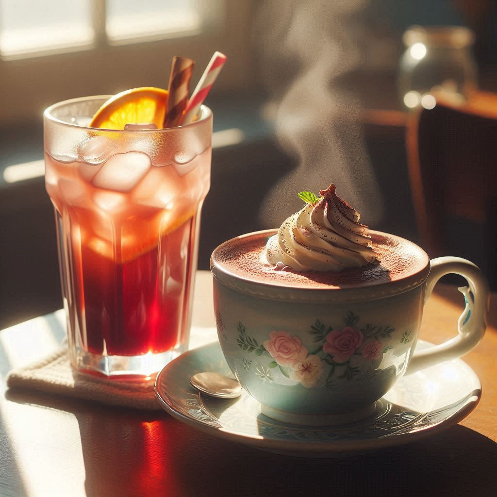 Iced tea and hot chocolate on table