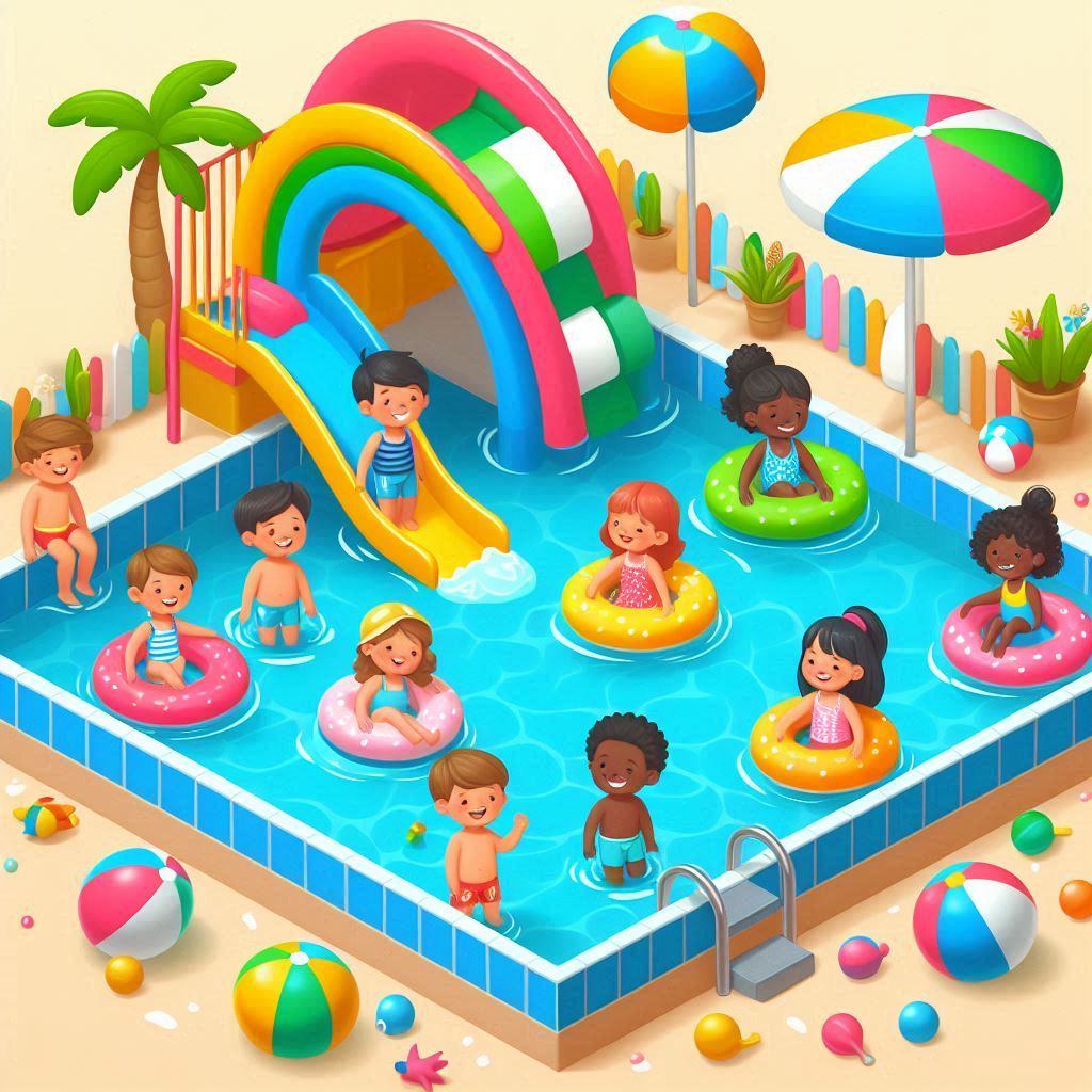 Children of various ages play in a swimming pool with inflatable rings and a slide.