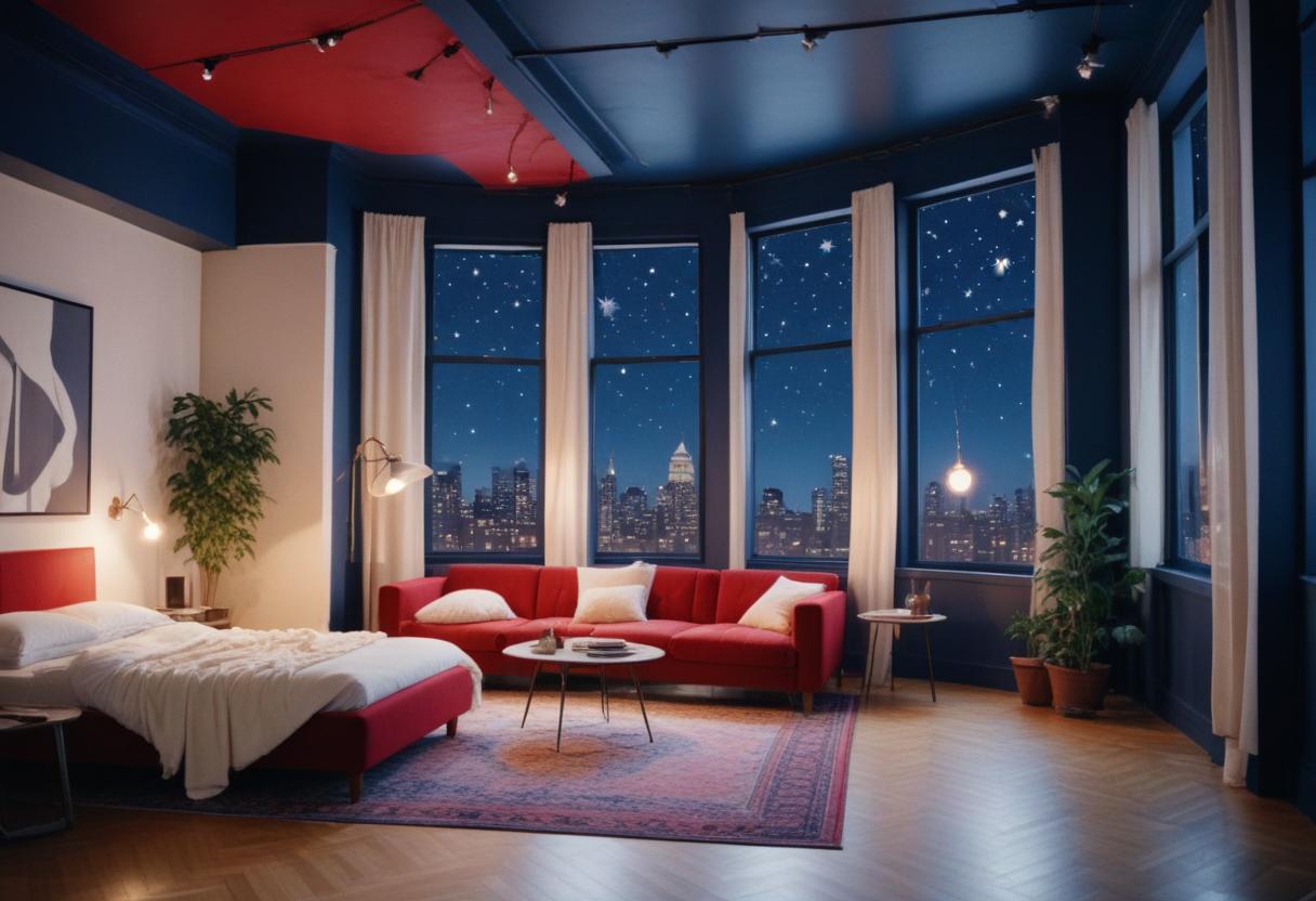 apartment, bed, building, city, cityscape, couch, floor, furniture, interior, lamp, light, living, night, room, rug, skyline, sofa, stars, view, window