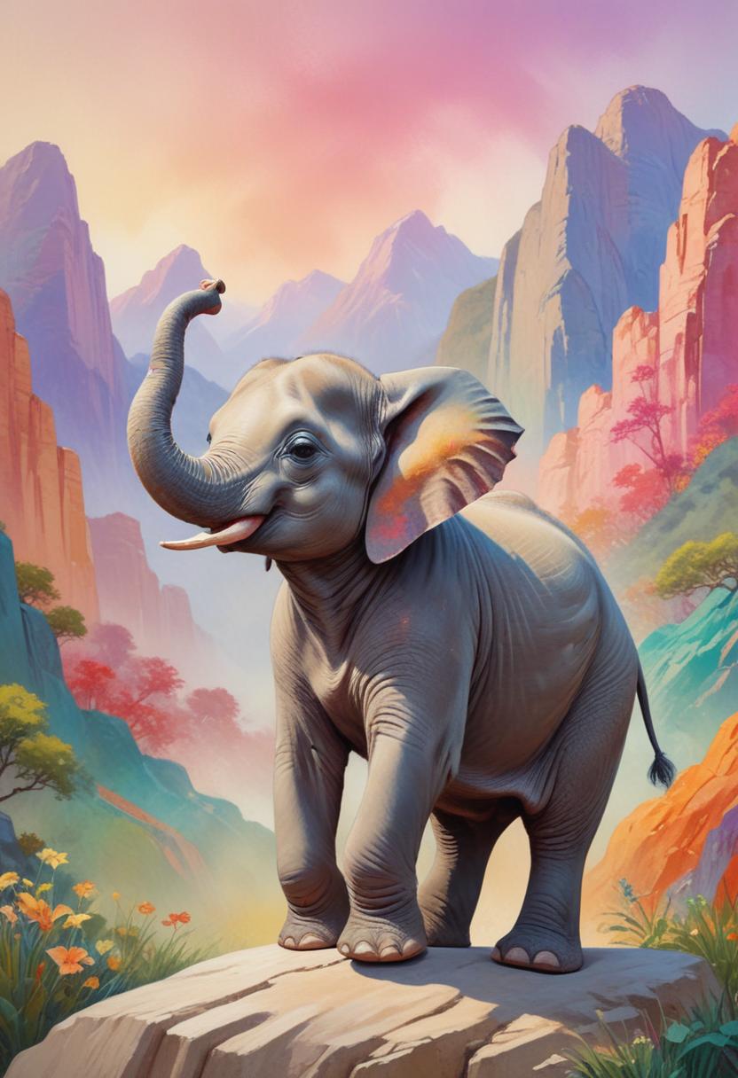A young elephant stands on a rocky ledge, facing the viewer, with a lush, colorful mountain landscape behind it.