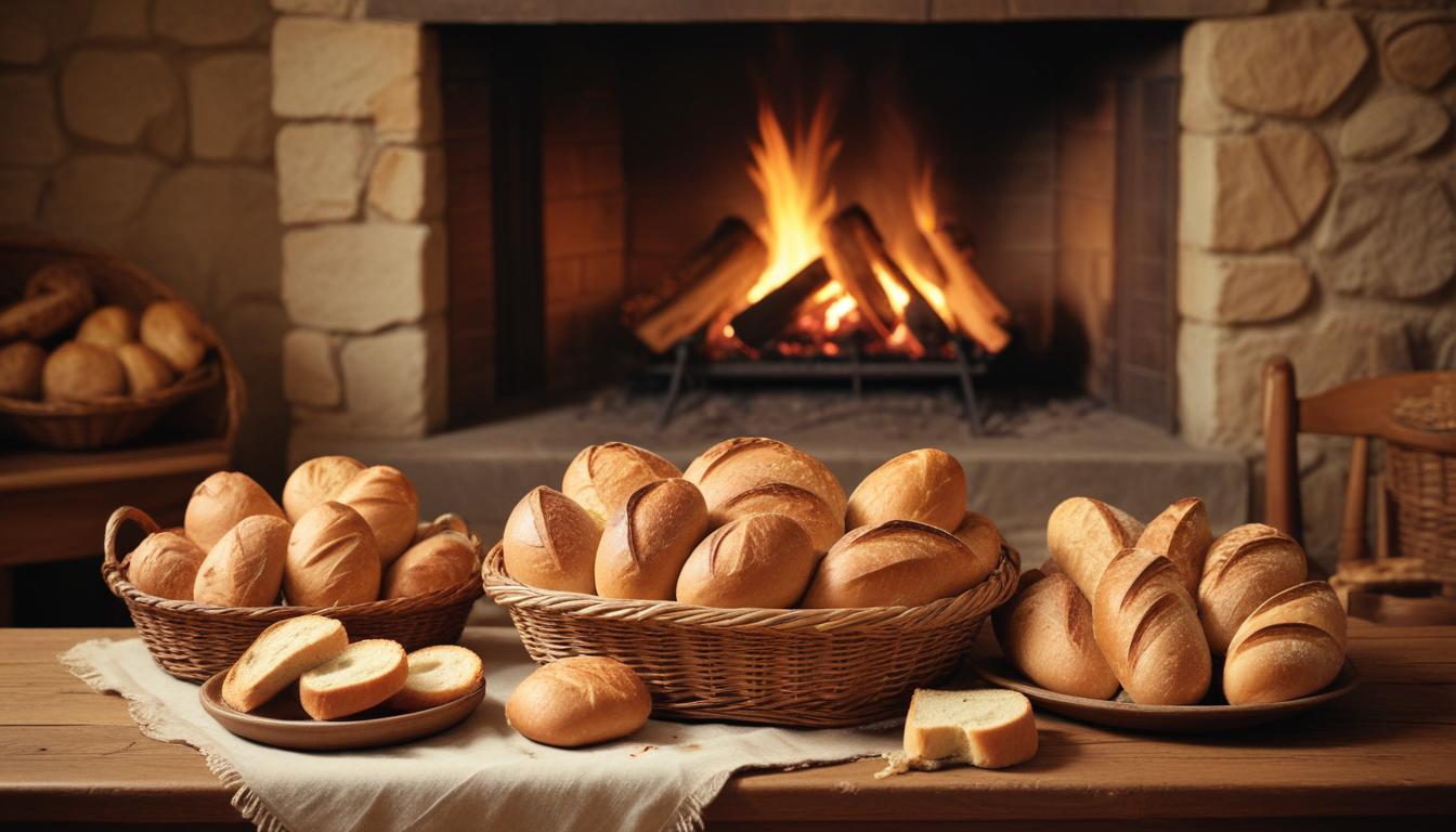 A rustic fireplace with a roaring fire is behind a table covered with loaves of freshly baked bread.
