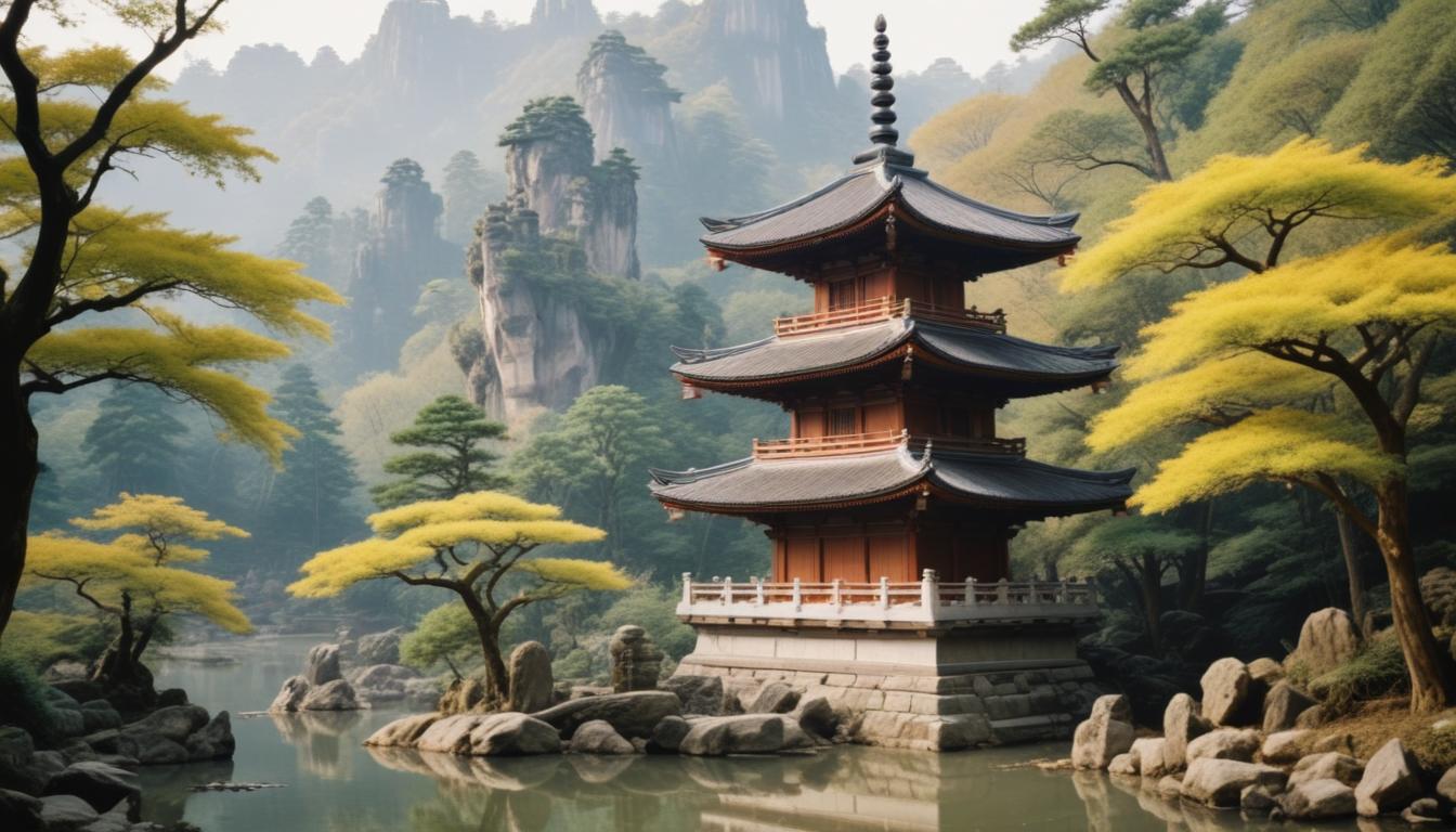 A traditional pagoda stands serenely by a tranquil lake, nestled among lush trees and towering rock formations.