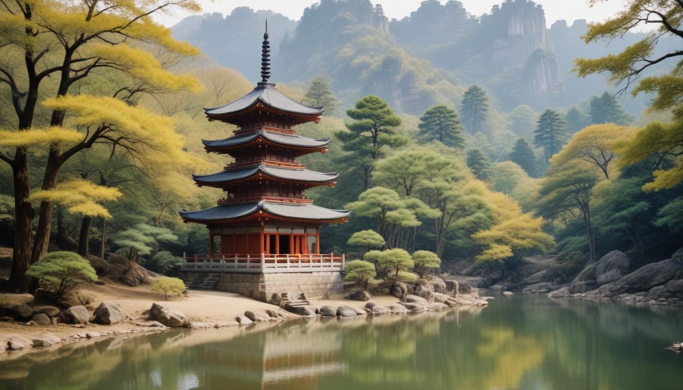 A traditional Japanese pagoda stands by a serene lake surrounded by lush greenery and mountains.