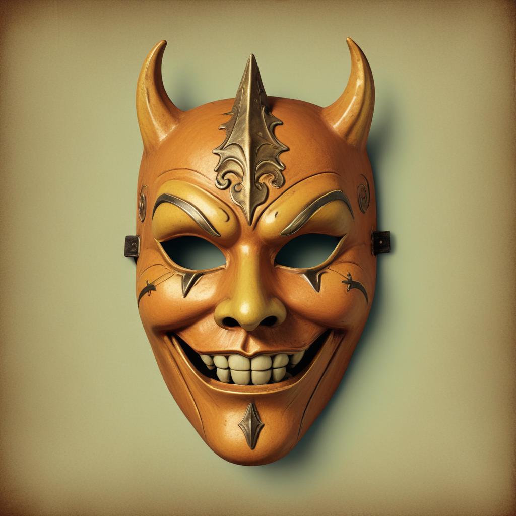 A close-up of an orange devil mask with horns and a wide, toothy grin.