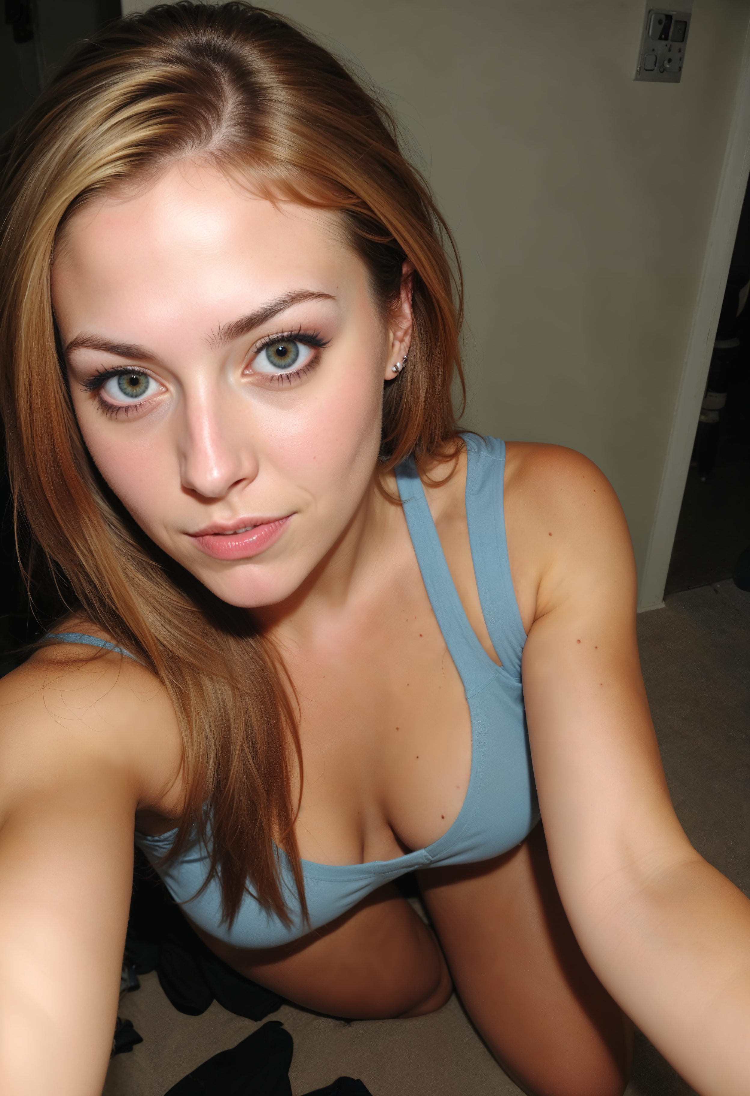 beauty, blue, brown, camera, casual, clothing, expression, face, fashion, female, hair, indoor, look, portrait, selfie, smile, tank, top, woman, young