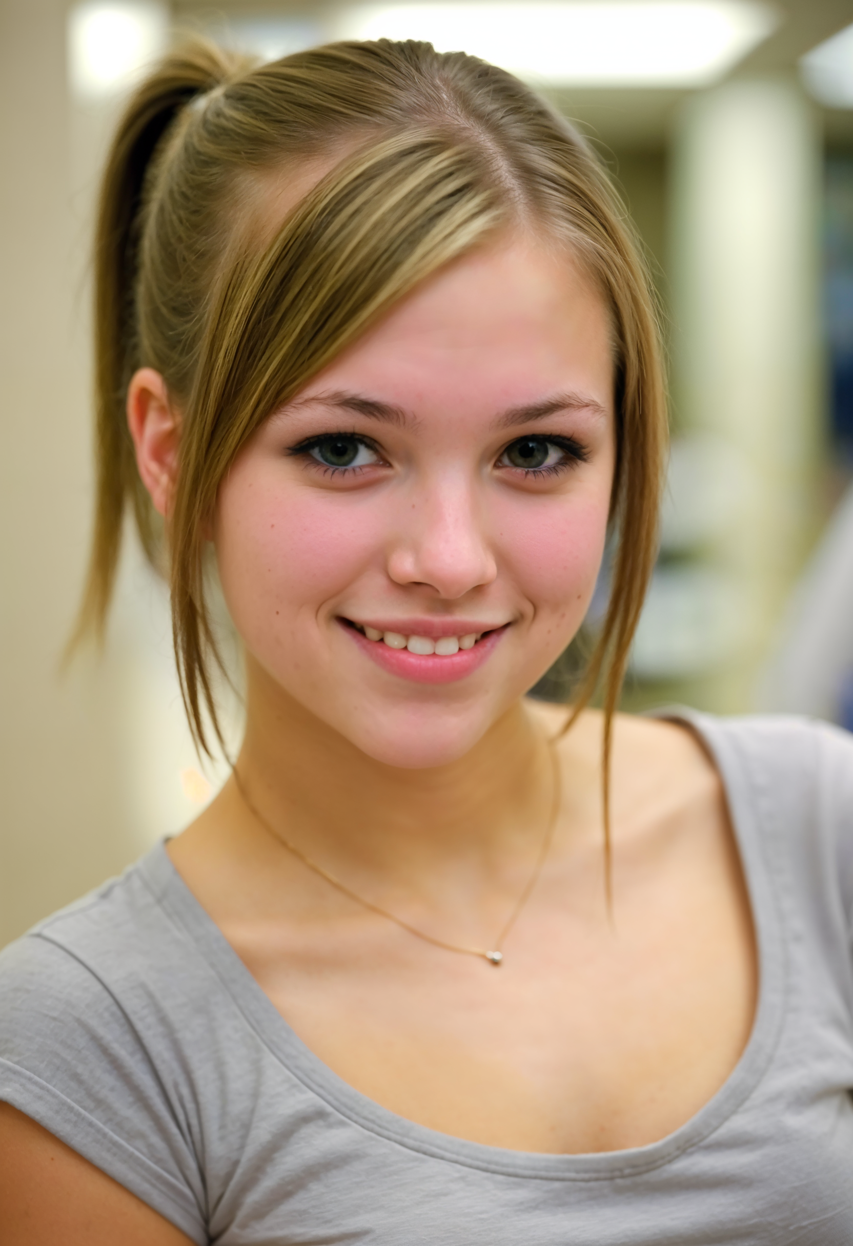 blonde, brown, cheerful, eyes, face, female, girl, grey, hair, happy, indoor, indoors, necklace, ponytail, portrait, shirt, smile, t-shirt, woman, young