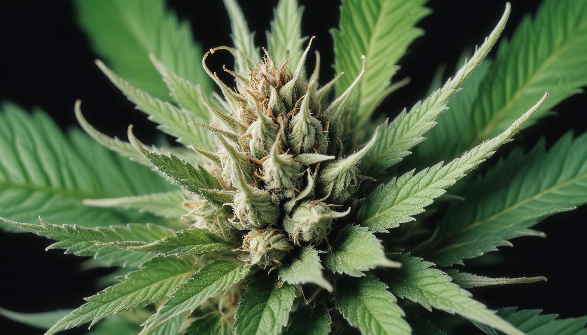 A close-up shot of a marijuana bud with green leaves and a dark background.