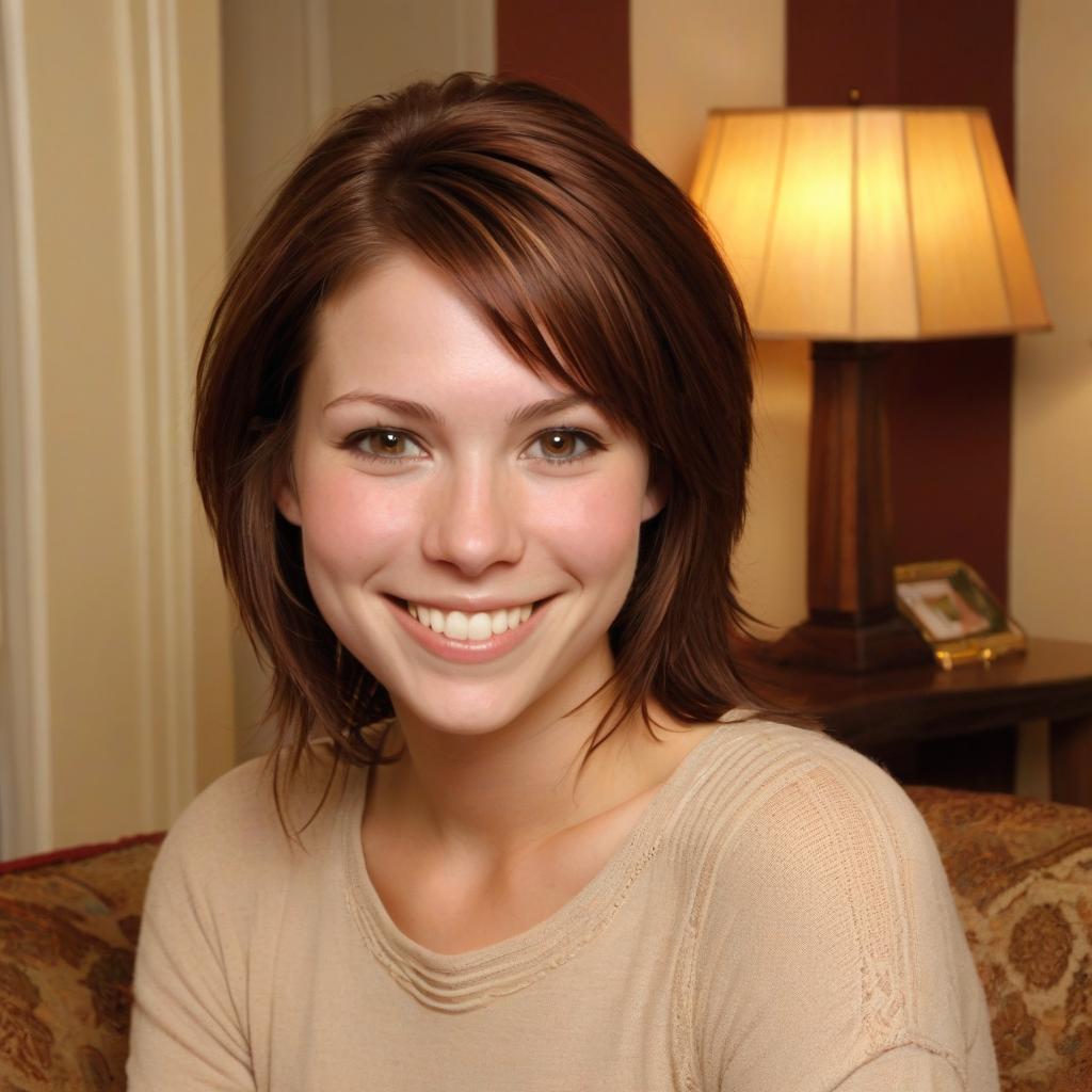 A young woman with brown hair smiles at the camera while sitting on a couch.