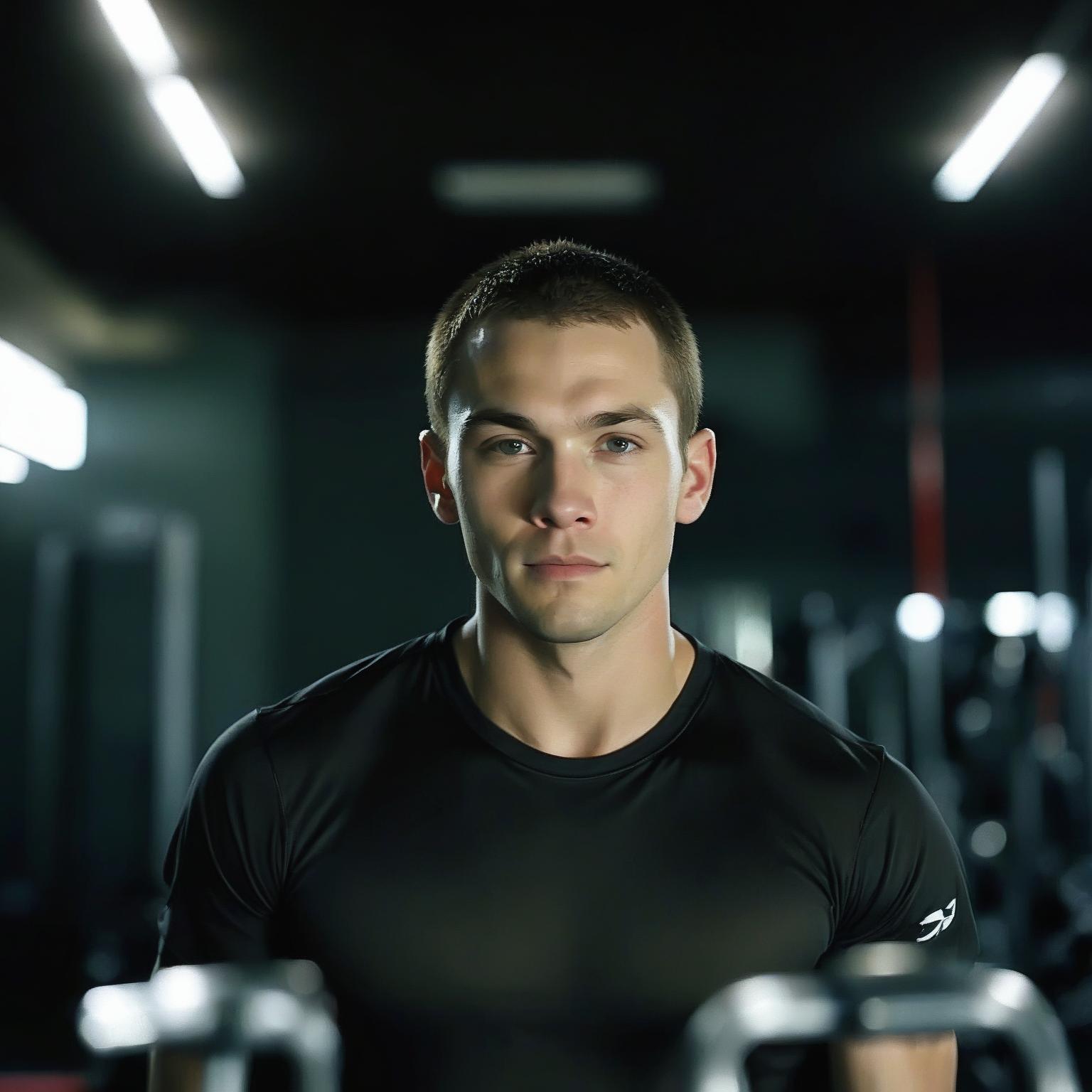 A young man in a black shirt poses in a gym, looking directly at the camera.