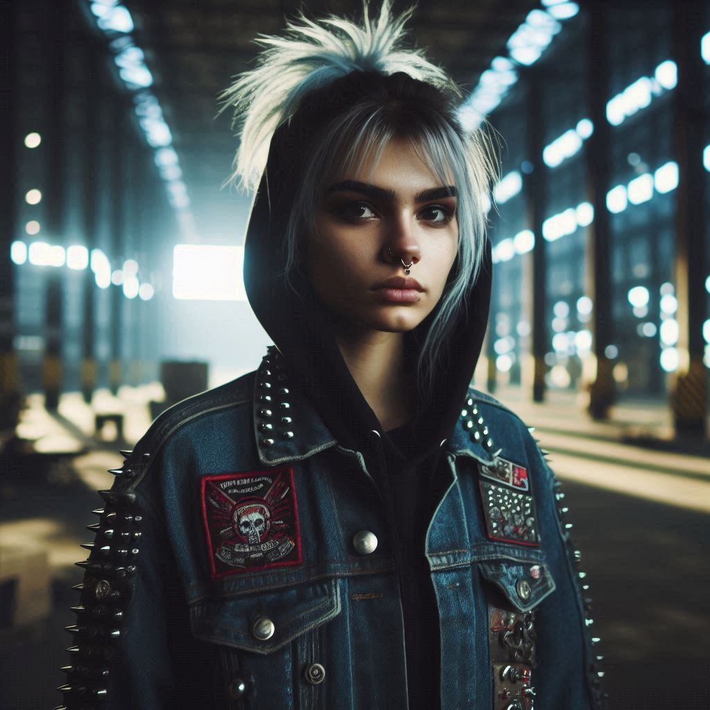 A young woman with blue hair and a nose ring stands in an industrial setting, wearing a denim jacket with spikes and patches.