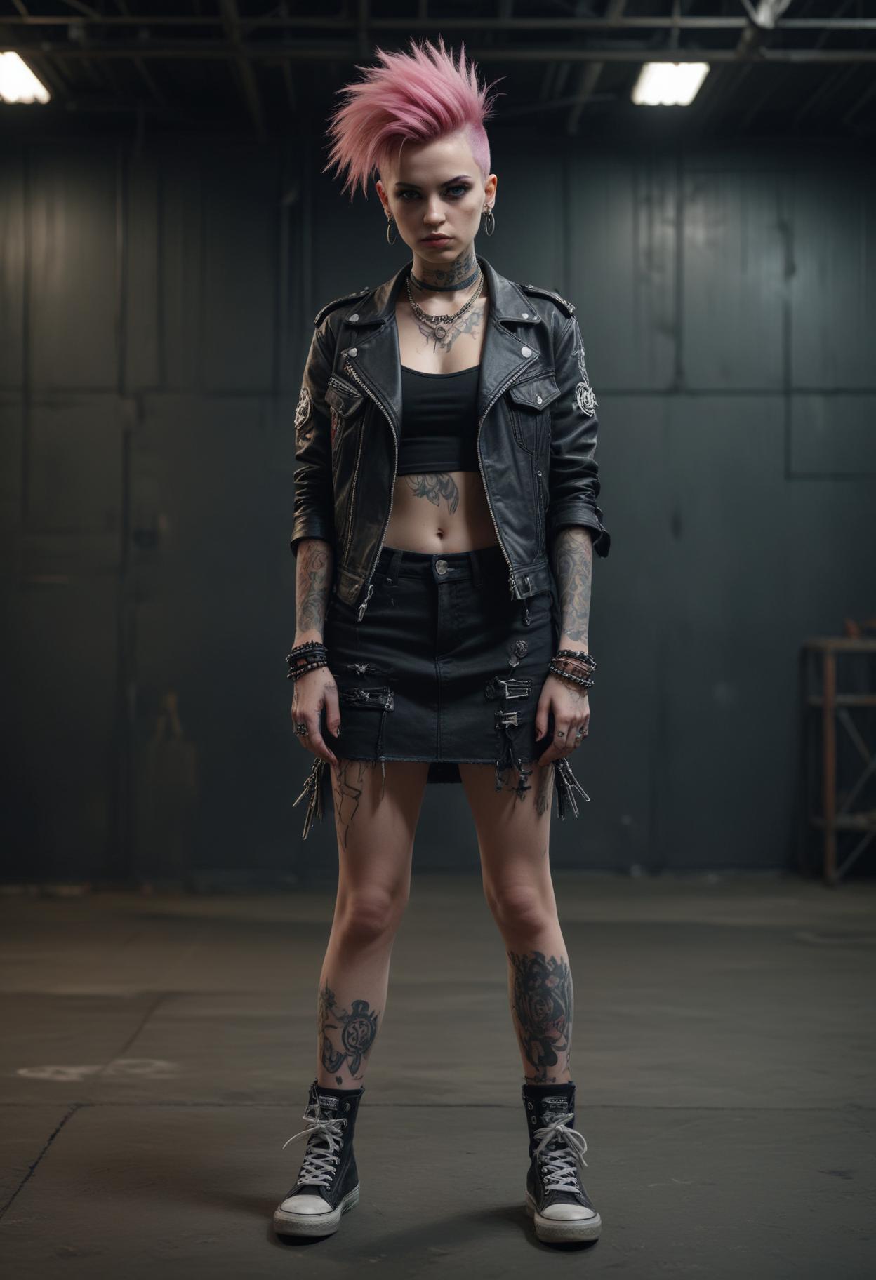 A woman with pink hair, tattoos, and a leather jacket stands in a dimly lit industrial space.