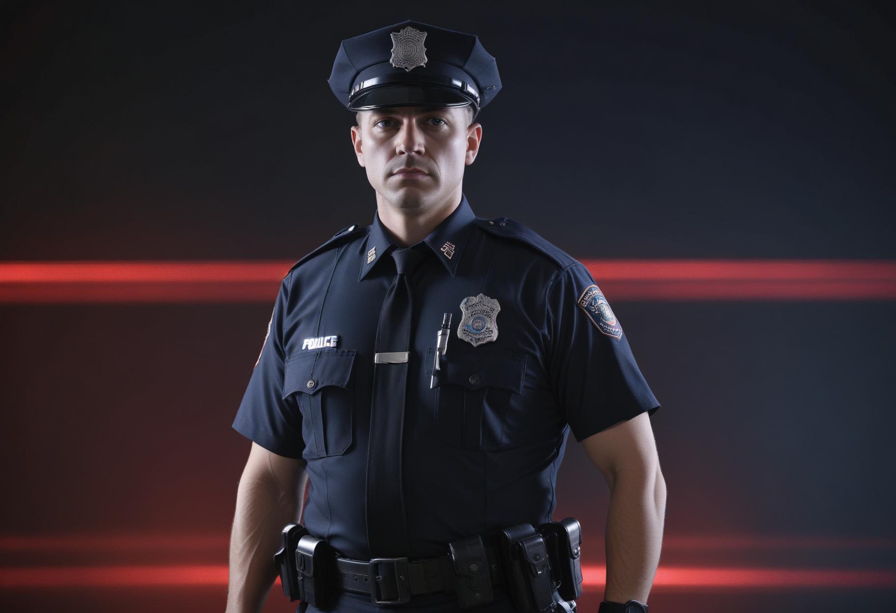 background, dark, duty, enforcement, front, justice, law, light, officer, order, peace, police, protection, public, red, safety, security, service, standing, uniform