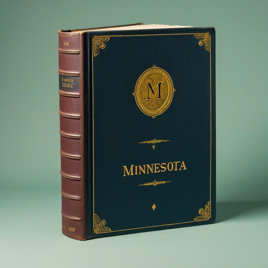 A blue hardback book with a gold inscription of Minnesota and a M on the spine.