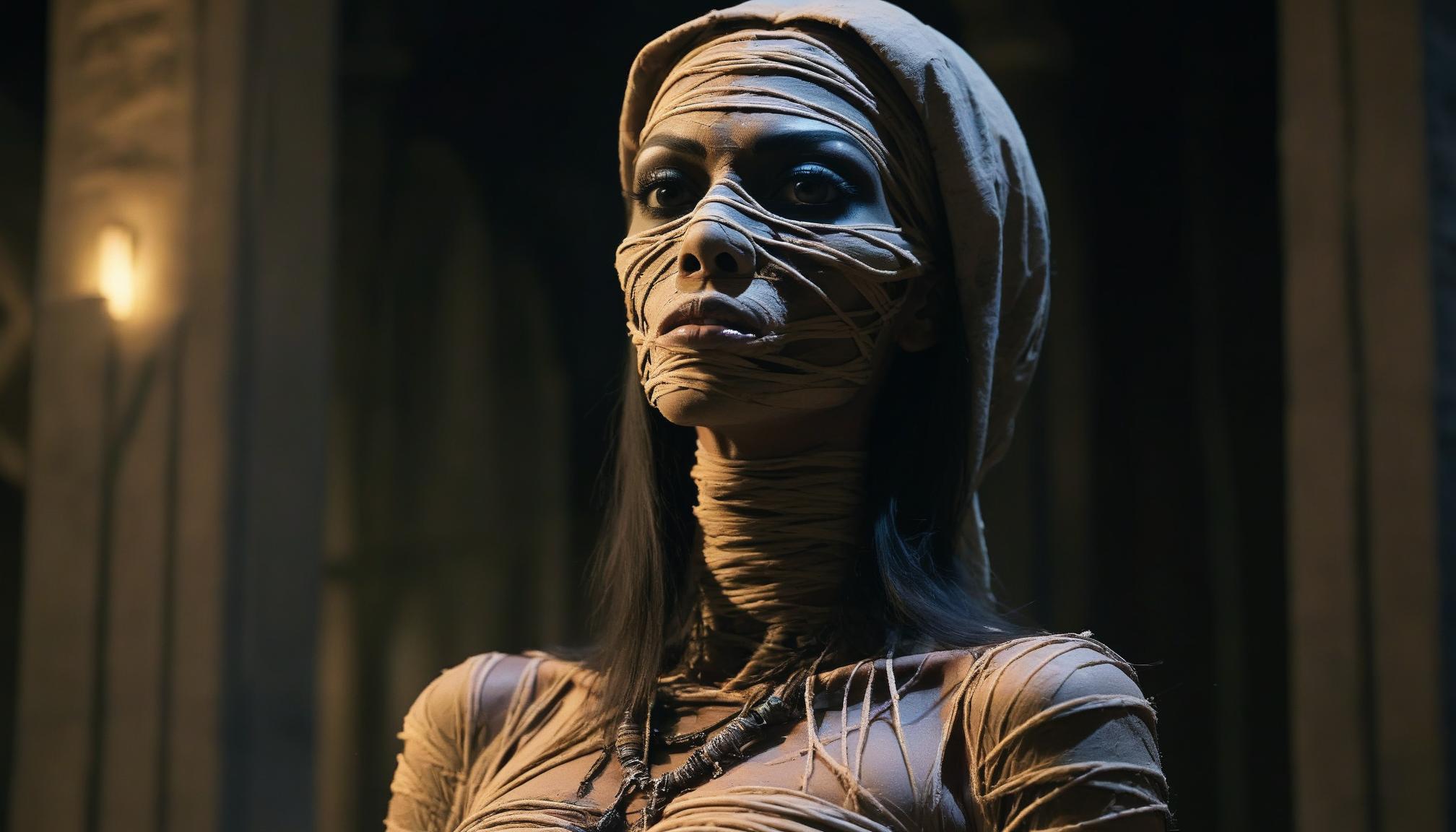 A woman, her body wrapped in bandages, stands in a dark tomb setting.